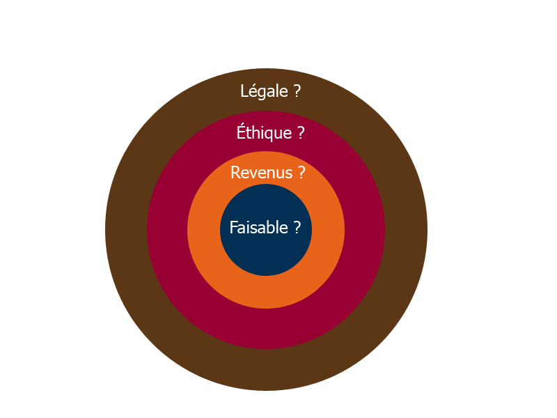 Mais pour mener à bien cette mission, des critères généraux pour évaluer une ligne de conduite possible doivent être pris en considération et qui vont en somme donner la décision finale et qui vont de la faisabilité de l’opération du coté des ressources tangibles et intangibles, les revenus futures espérés, le bien respect de l’éthique à la légalité de l’opération.
