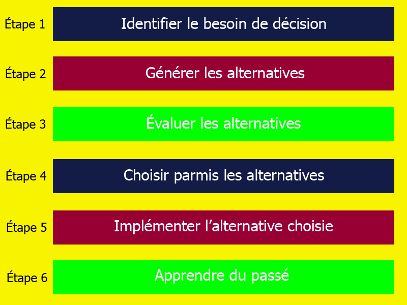 Tout ceci à fait que Bank of America suit un processus de prise de décision qui se divise en six étapes, soit l’identification du besoin de décision, la génération des alternatives, l’évaluation des alternatives, le choix parmi une de ces alternatives, l’implémentation de l’alternative choisi et enfin l’enseignement par la rétroaction.